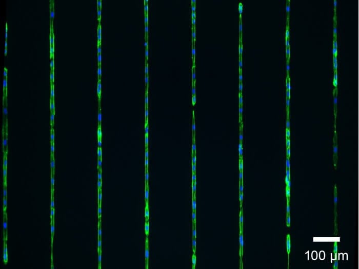 利用ibidi的µ-Patterns技術(shù),可從細(xì)胞懸液中創(chuàng)建線性陳列的圖案,引導(dǎo)細(xì)胞沿一維(1D)微通道特異性附著和生長。